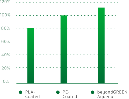 Relative cost index compares average production costs per unit to standard PE-coated cups (100%). Lower values indicate cost efficiency due to vertical integration and optimized coating technology.